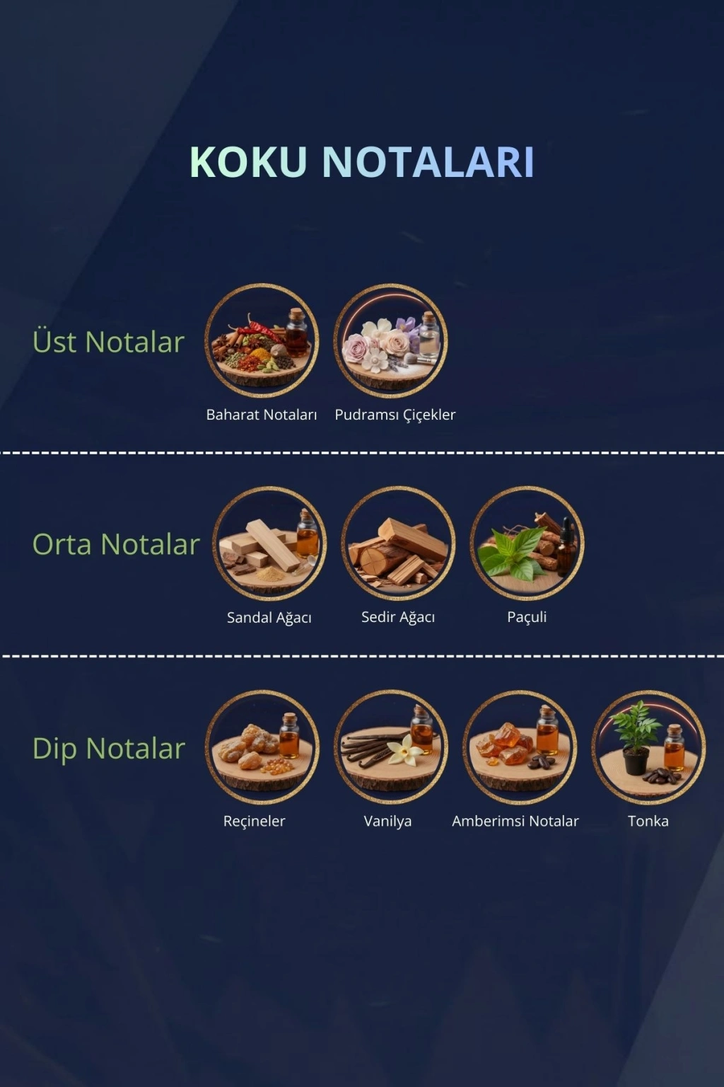 Özenle seçilen hammaddelerin özel olgunlaştırma süreciyle oluşturulan kompozisyon, baharatın enerjik kıvılcımıyla açılır ve pudramsı çiçek dokunuşlarıyla yumuşar. Kalpte yer alan değerli ağaçlar kokuya kadifemsi bir yoğunluk kazandırırken, dipte yükselen reçineler ve sıcak balsamik notalar ten üzerinde kalıcı ve baştan çıkarıcı bir iz bırakır. Son bölümde hissedilen kremamsı tatlılık ve amberimsi sıcaklık, kokuyu sarıcı bir zarafete dönüştürür.